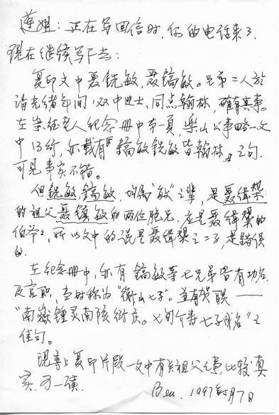 泽方兄如晤: 几年前某日,见“世界日报”刊登了一篇文章(见附件)。本人孤陋寡闻,但祖父辈们的情况尚知一二,故发现文中有关辈份部分明显有误。一次与寓居旧金山的炳舅舅聂光址先生电话闲谈中提及此事。此后我们又将该文拷贝寄去请教。不日即收到回函,详细介绍了二位先辈。承蒙炳舅舅赐教,才得以搞清他们的身份。今得到炳舅舅同意,特将此信函及文章复印件寄给你。请登网站以澄清史实。 文和 崇珩 6-26-04 |