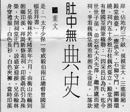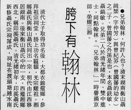 子环溪公焘以乾隆丁巳进士选授陕西镇安知县。乐山公驰书训子,言甚深至,载于《经世文编》。寿至九十三,环溪公亦年七十八始卒。环溪公孙京圃公(镐敏)、心如公(镜敏)、蓉峰公(铣敏)联翩科第,扬历曹司,均在嘉庆初年,湘南于时称盛。亦峰公即环溪公曾孙也。以咸丰癸丑翰林,散馆拣发广东知县,历宰剧邑,累官至高州府知府,补用道员。广东剧邑,号为难治,公勤恤民隐,循声昭灼,所刊《冈州公牍》等书,为公一生精力所萃。余之来归,已不及见君舅。张太夫人素性严明,虽不知书而无敢欺者。然太夫人对余亦鲜有疾言厉色也。 ...... 由此可知,聂镐敏及聂铣敏是环溪公的孙子,而聂缉椝的父亲聂亦峰是环溪公的曾孙,所以聂镐敏及聂铣敏比聂缉椝长两辈。本文弄错了辈份是其一。曾国荃成名于同治末年、光绪初年,聂家宗祠有曾国荃的题词,其落成就一定是光绪年间的事,而聂镐敏及聂铣敏兄弟是嘉庆初年的进士,显然不可能经过了嘉庆、道光、咸丰、同治四朝,再来拜谒光绪年间落成的聂家宗祠,此其二。从这副对联的用词来看,似乎也与翰林的身份不符,倒像是清末民初的文人所撰。 |