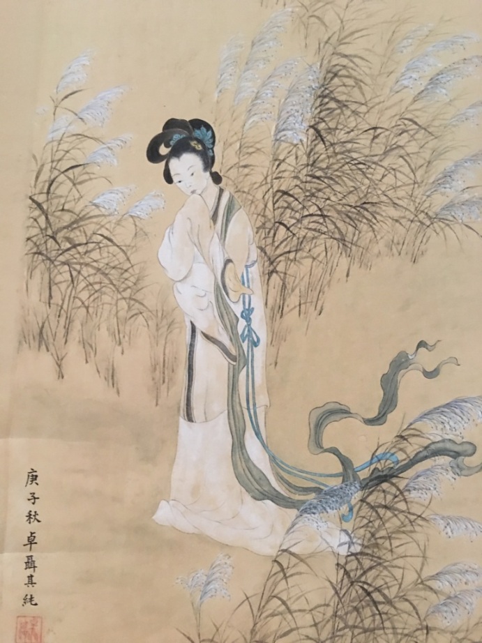 我父親一家兄弟姐妹,這些我的長輩們,個個都喜歡繪畫,素描或是寫生,也都善長書法。我在小學或是中學時,他們都不時在我面前常做此嗜好。這也是我在台灣童年的幸福紀憶。經過了這麼多年,我無数次的遷移,我能夠留下的前人作品已經不多了,但是卻是個個作品都極珍貴,都留著不可磨滅的他們給我的美好往事… 看著眼前,這張『仕女圖』是我奶奶在六十年前的(1960庚子年)洛杉磯的作品。當時的洛杉磯,没有方便的中國城。奶奶住在當時姑姑Hollywood Hill山上的家,奶奶用的毛筆也不好,時常掉毛,顏料也是外孫兒女處用的。她畫作完成後,自己用麵粉加水,用對比例,做成漿糊將它裱好。我祖母用著這土法練鋼(hand made)方法的作品,送了給我。記得那是在1969秋天,我和外子將要離開洛杉磯搬到休士頓時。 想到奶奶的作品,不覺想起了我那曾經走過清末到現代年代的奶奶,她從長沙,北京,上海,台灣,到美國,是走過多少中國苦難的不凡的女性。她本來是出生很為顯赫的娘家,但是她一生屢經中國的軍閥,日寇多次地戰亂,引起她的一串串苦難。二戰時,駐婆羅州她的外交官兒子(我二伯)拒降,被日軍殘忍虐殺。1949年奶奶為了照顧垂死的祖父(我爺爺),隻身留在上海陪伴夫君,卻堅持又無私地定要所有她的子女離開內亂,先去台灣等她。
