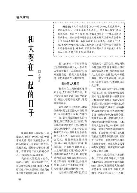我的曾祖母聂曾纪芬,号崇德老人(1852—1943),我们曾孙辈叫太婆,是曾国藩的季女(湖南人称满女)。太婆以仁德为怀,宽宏大度,凝聚着七子四女、孙辈、曾孙辈近二百人的爱心孝心,主宰大家族,温馨和谐。 我的祖父聂其杰(云台,1880—1953),是太婆的第三子。祖父和我父母及我们姐弟五人合称三房,侍奉太婆同住,因此我有幸伴随太婆绕膝承欢十五年。 我三四岁时一手拎着烘篮(为烘暖腿脚的器具),一手牵着太婆软和的手,走出起居室,到堂屋餐桌边,待佣人扶太婆坐稳,便把烘篮放在太婆的腿旁。 老公馆,大花园 我出生在上海杨浦区辽阳路老宅,人们称之为老公馆。老宅常让我魂牵梦萦,每每神游梦境,重温太婆的音容笑貌,寻觅童年的欢乐。 老宅坐落在上海东区,北临江山路(现为惠民路),东沿辽阳路,由北向南呈长方形,占地约十一亩。老宅周边围有密实的竹篱笆,涂以黑漆,高近二层楼,西边隔空相望聂中丞公学(即华童公学、缉椝中学、沪东中学),是我祖父聂云台(曾任上海总商会会长,英租界工部局华董)为纪念其父,即我曾祖父聂缉椝(1855—1911,晚清任上海道、浙江巡抚)于1915年捐地15亩,由上海英租界工部局创办,培养杨浦区的劳动人民子弟。老宅篱笆内北部是四幢格局相同的红砖三层楼房,两两相连,分前后两排,其间有空地相隔,我们三房伴随太婆住前排两侧一幢。 这是座三层楼的住宅,经过天井进入一层的堂屋。堂屋两侧各陈设四张紫檀木镶篏大理石面的宽大扶手椅,两两相隔以茶几,北墙正中是神龛,供奉佛像多尊。祖父住堂屋东侧上房,两侧上房是个大客厅,太婆偶尔在此会客。 堂屋后面由敦实的木楼梯可以上二层楼。宽敞的堂屋北墙正中高悬曾国藩手书赠其亲家公聂亦峰(清翰林,广东新宁县知事)的对联:“德业旧传霄汉上,政声多在道途间”,镶在长大的镜框中,宣纸虽已泛黄,但苍劲浑厚的字迹、磅礴的气势,却依然夺目。对联下方设置一张椭圆形大桌,两端置精美的青瓷大花瓶,匹配着两大盒万年青,大叶肥硕,四季常青。堂屋东西两侧墙壁铺着字画轴,下方紫檀木椅间的茶几陈设着盆花,随季节更换绽放。堂屋正中是餐桌,太婆和我父母姐弟在此用午晚餐。堂屋东侧是太婆的起居室卧室,西侧前后屋由我父母及姐弟居住。 登上三楼,堂屋正中北墙供奉上五代祖宗遗像神位,下设置长长的条桌,案前列置高大的锡烛台、香炉,案前围着大红绒的原毡桌围。每逢年节,如除夕、清明节、中元节(农历七月十五日)必燃烛焚香,案上整齐地摆着专供祭祀用的盅筷至少有二十付和许多小碗白米饭,还有大碗热气腾腾的供菜。祭祀准备就绪,除夕祭祀时,楼下花园鸣鞭蛇,各房从爷爷辈、叔辈以下男女,分批按辈叩拜。正堂西侧是宽敞的佛堂,供奉佛像多尊,长辈们祭祀后也在此跪拜祈福。正堂的东侧是偌大的箱子间,地上平列着一排排的箱笼,收置全家上下更换季节闲置的衣被。箱子间平日门窗紧闭,我偶尔随大人们进入这个神秘的地方,只觉有一股霉味和呛人的灰尘。住宅二楼堂屋正南面对天井是个阳台。夏日傍晚,天井经水枪喷洒,暑溽稍退,太婆常在此坐在藤椅上,轻抚团扇,悠然眺望密林浓荫,静听鸟语蝉鸣。墙边的洗澡花怒放,贪婪地吸收丝丝清凉的气息。这时我们一帮孩子从树丛中钻出来,个个大汗淋漓,小掛儿都溻在背上,抬头招呼太婆,便径直往家跑。 正对阳台是条水泥大道,由北向南直通大门。门旁有个门房小屋,由老周师傅(春生)看管。紧挨着门房的是一座玻璃花房,里面是层层阶梯式木架直攀房顶,陈列着无数盆花。梅花、月季、玫瑰、丁香、吊兰、斑竹、芍药、绣球、白兰、茉莉、海棠,随季节绽开,万紫千红,目不暇接。冬日我进花房,室内温暖如春,闻闻腊梅、红梅,又赶忙闻闻一丛丛清香的水仙花,也顾不上到炉边去烘烘冻红了的小手。 楼前从园篱笆西侧翼东跨越约四十米,竖立着一座铁架,高达二层楼房高。每年暮春三月太婆生日(农历三月三十日)前后,藤蔓纵横布满高架的“十姊妹”(如核桃大小,貌似蔷薇的粉红色花朵)绽开怒放,绯云缭绕,疑是烟,是屏,是帐,是棉,是天女织成?甜香飘溢,陶醉人间,忙煞蜂蝶。 大道西侧冬青树后,是一座红瓦灰墙的佛堂,掩映在苍松翠柏丛中。堂内供奉佛像多尊,天花板上悬挂着荷花灯,祖父常来此礼拜,我们一帮孩子常在佛堂前槛的树荫下嬉戏,初春玉兰早放,肥硕的乳白色花朵,清香飘逸,惹人垂爱。太婆时而临窗眺望,说今年的玉兰胜似往年。接着迎春花开绽,一片芽黄,渐感派春意。月季、玫瑰婀娜多姿,在微风中摇曳,散发浓郁的甜香,我禁不住凑上去闻闻,蜂蝶亦趋之若鹜,挥之不去。尔后,丁香花淡紫洁白,奇葩如云。凤仙、海棠、鸡冠花、大理花、菊花随季节轮番绽开,争奇斗艳。我们在这个百花园中欢畅游乐,享尽造物主的恩赐,常流连忘返。 百花园的南面是菜园,畦陇整齐划一,瓜菜豆四季不断,轮番成熟,各呈异彩。我们常在藤蔓支架间追赶蜻蜓,捉蝴蝶,蹲在菜棵间捡青虫,拿小树枝挑毛毛虫。马齿苋开小黄花,生机盎然,盖满了畦背浅沟,任人践踏。带白霜的冬瓜跟枕头那么大,扁南瓜可以当小凳坐,小红辣朝天开,紫茄子油光发亮。老花匠欣慰地坐在地头抽袋烟,揩揩汗,怜爱地冲着我们微笑。 菜园南端是一个正方形的葡萄架,高丈余。每到初秋垂挂着一串串绛紫色带白霜的葡萄,令人垂涏。紧挨着是个大草坪,绿茵如毯,姑姑叔叔