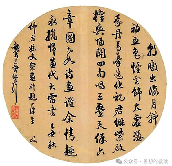 曾纪泽《题所画聂仲芳观察妹丈扇》手稿 原创:槠山灯影 转载:思想的救赎 曾纪泽《曾惠敏公全集》有《题所画聂仲芳观察妹丈扇》诗:“朝暾出海月斜初,五色烟云饰太虚。凭我丹青摹造化,祝君绯紫启权舆。阳关四句唱三叠,天保六章图九如。诗画送君情趣永,携归兼当大雷书。” “聂仲芳”即聂缉椝,曾纪泽之妹曾纪芬的丈夫。 曾纪芬《崇德老人年谱》己丑光绪十五年条下记云:“是年,忠襄公奏保中丞公以道员留苏补用,并交军机处存记。得保后赴京引见。惠敏公在京邸,手画朝日江山于纨扇,并题诗赠行。” “中丞公”即聂缉椝。此诗即《题所画聂仲芳观察妹丈扇》。 今见此诗之手稿版,文字微异:“朝暾出海月斜初,五色烟云饰太虚。凭我丹青摹造化,祝君绯紫启权舆。阳关四句唱三叠,天保六章图九如。诗画证余情趣永,携归兼代大雷书。己丑秋仲方妹丈索画,并题一律奉政。劼刚兄曾纪泽。” 辄全集所收为后改定稿。