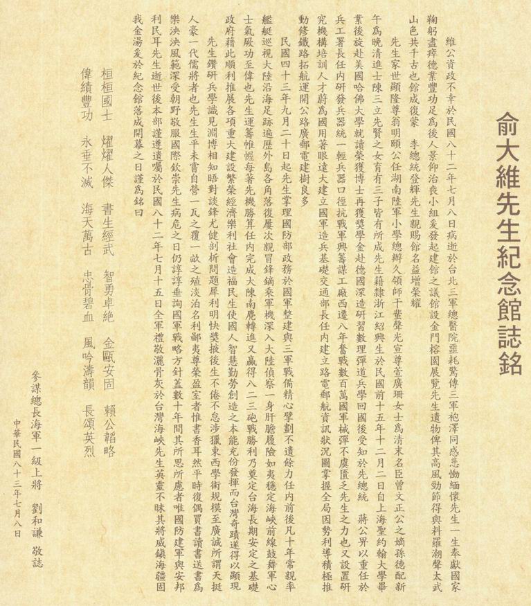 俞大维先生纪念馆志铭